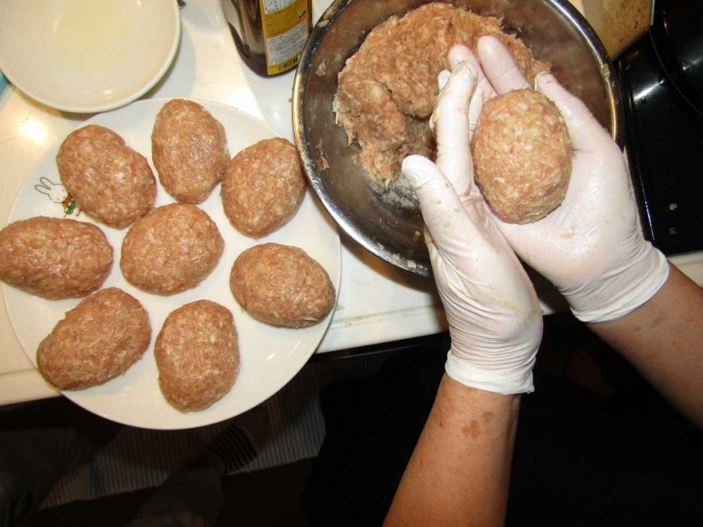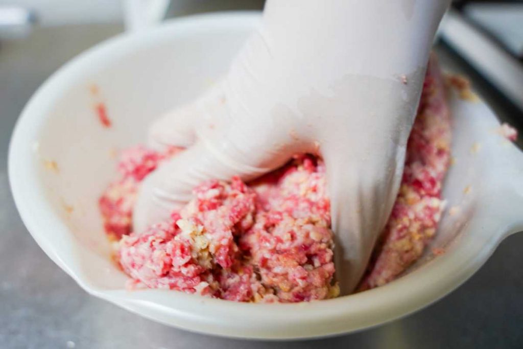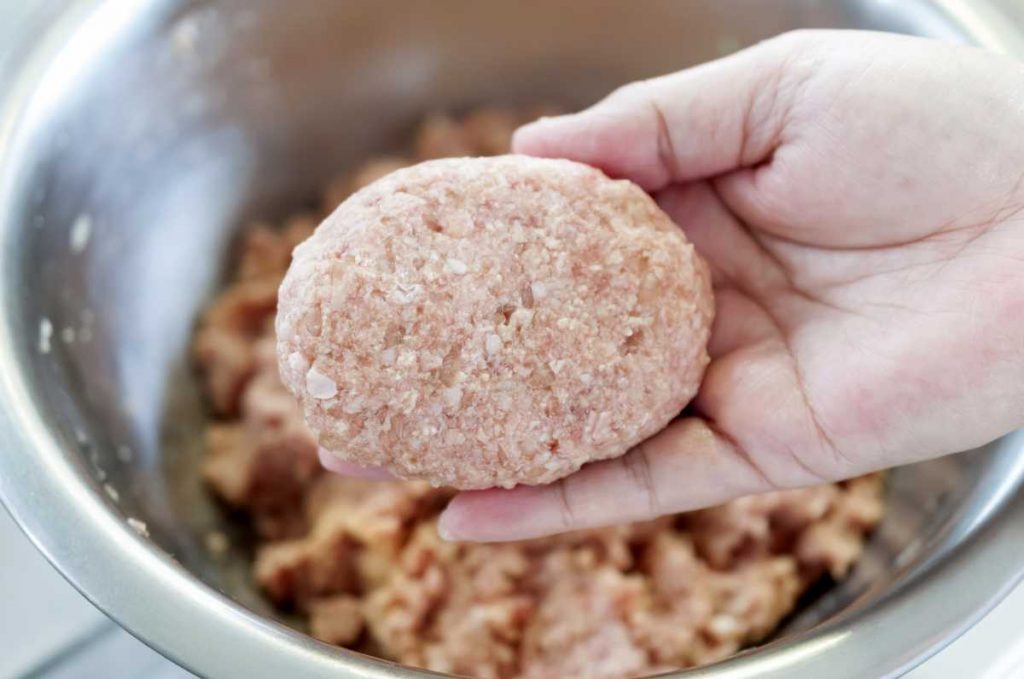 ミキサーは、ひき肉と他の材料(玉ねぎやパン粉)を均一に混ぜ合わせることに長けている機械です。小型機であっても混ぜムラが少ないのが特徴です。